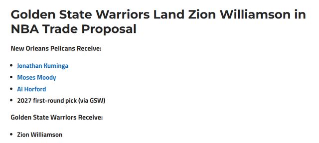 這份具體方案是勇士送出庫明加、穆迪、霍福德和2027年的首輪簽,從鵜鶘換來錫安。Piercey還從雙方角度分析為什么可以做這樣一筆交易。