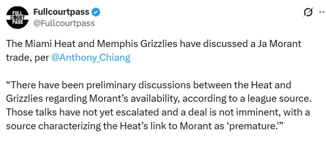 熱火愿意為得到莫蘭特付出多少籌碼?Shams稱,“灰熊隊會將選秀權和年輕球員作為首要的交易回報”,但熱火并不愿在潛在的莫蘭特交易中送出任何選秀權,或是隊內最優秀的年輕球員。